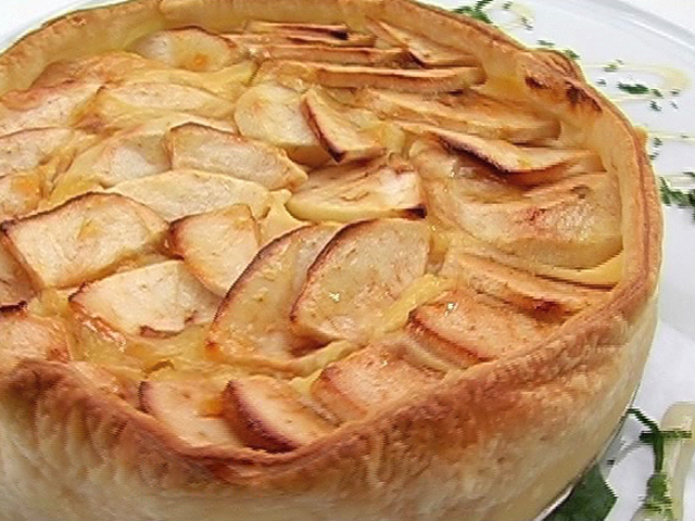 Очень нежный и пышный яблочный пирог.Состав:яйца — 5 штук;яблоки — 6 штук;молоко — 4 стакана;абрикосовый джем — 100 гр;сахар — 200 гр;крахмал — 2 столовых ложки;лимон — 1 долька;корица — 1 чайная ложка;сдобное тесто — 1 корж.
