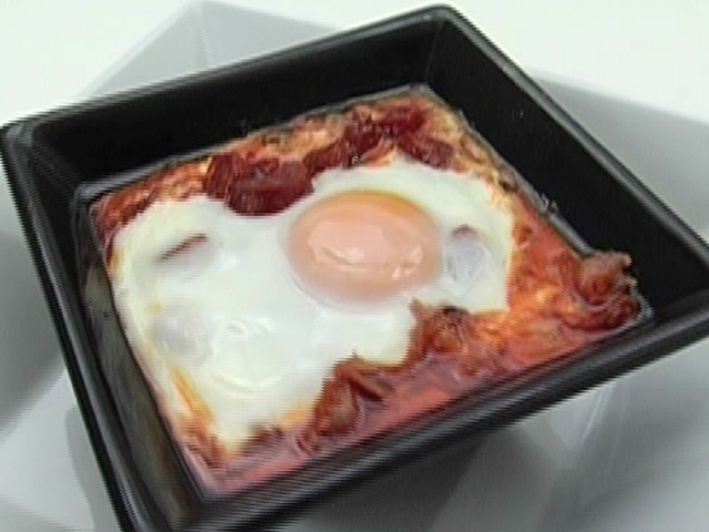 Необычный завтрак на каждый день.Состав:яйца — 1 штука;томатная паста — 1/2 стакана;лук — 1/2 штуки;чеснок — 1 зубчик;зеленый горошек — 1/4 стакана;немного ветчины, острых колбасок, болгарского переца, оливкового масла.